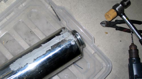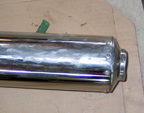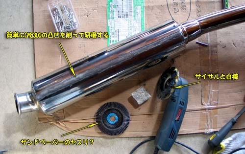 | 次の朝、GM8300を塗った部分を触ってみると固まっているようだ。 サンドペーパーの付いたヤスリをサンダーに取り付けて凸凹をならす。 次に、オフセットサイザルと白棒でパテとステンレスを研磨した(GM8300は研磨するとアルミのように輝くらしい)。 あまりきれいにしすぎるとパテが薄くなって排気圧で取れるといけないのでほどほどにした。 この切れ目の位置を一番見えにくい左下にしたので、汚くても目立たないのだが。 |