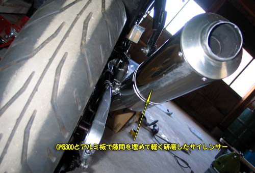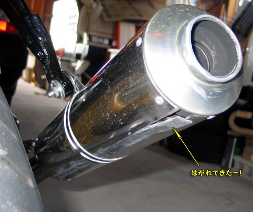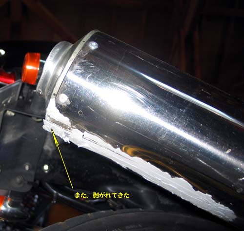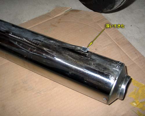 帰ってきてふとマフラーのサイレンサーを見てみると、何とGM8300で固定したアルミ板が剥がれてきているではないか。