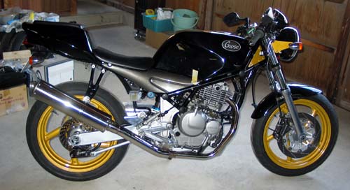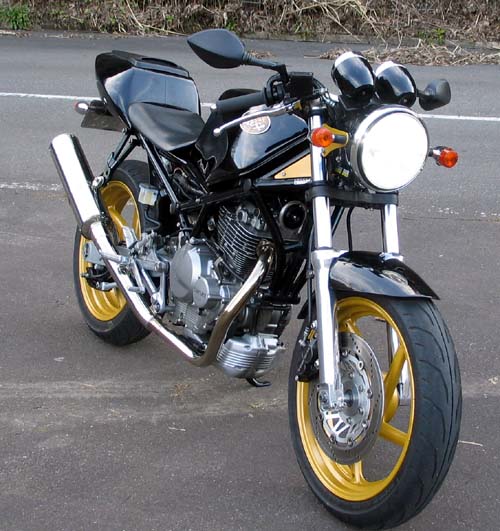 | 休憩の時のワンショットだ。 ステンレスサイレンサーがノーマルマフラーのように輝いている。 関係ないが、ヘッドライトはHIDで6000Kの白い光源でかっこいい! このマフラーはここから(下の写真)のビューが一番格好良いように思う。 裏返せば、他からのビューは少しアンバランスな感じがするのだ。 |
