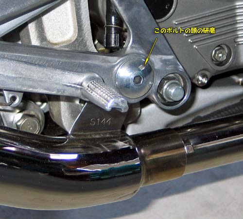 | 今回、ステップホルダーとマフラーをつなぐ頭のでっかいボルトをフェルトバフと青棒で鏡面にしてみた。 錆止めはCRC-336を塗布した。(本当は写真よりもピカピカである) |