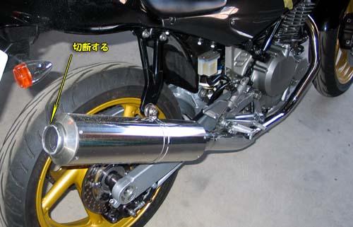 | 外が晴れているので、速攻でマフラーを組み立ててみる(本当は、一週間程度乾燥させようと思っていたが)。 マフラーを外したついでにエキゾーストパイプの研磨も行う。 そして、テールパイプの煙突のような形状が気に入らないので少し切断(地面に垂直で)してみた。 |