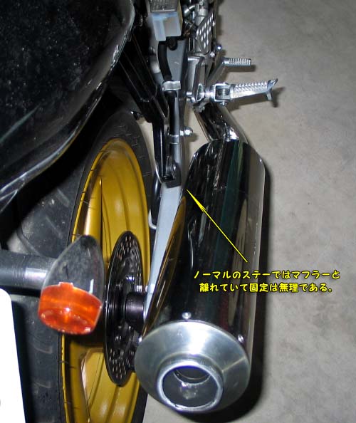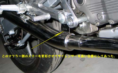 | マフラーのステップ下のステーを曲げて、無理やりノーマルサイレンサーステーに取り付けてあったので、サイレンサーがスイングアームと干渉しそうなのと、リアブレーキのレバーの下の部分が干渉しそうである。 |