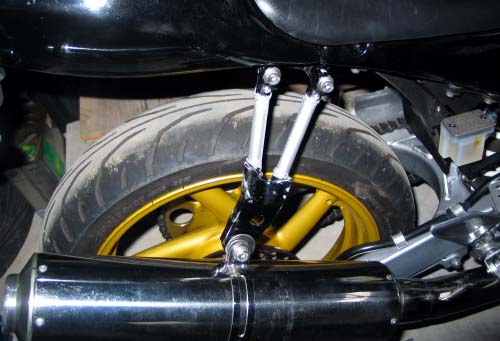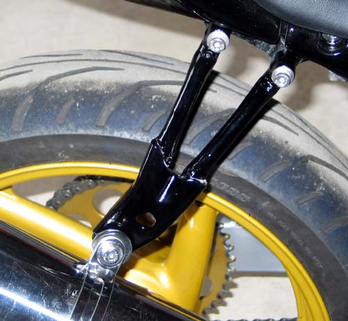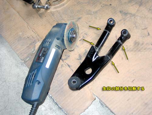 | タンデムステップは使用していないので、ノーマルのサイレンサーステーを改造してヨシムラのマフラーSCが正常(?)な位置関係になるようにすることにした。 まずは、下の写真のようにステーのパイプの部分を切断する。(ステーを伸ばすだけなら2カ所だけ切ってスペーサーをかますだけだが、色気を出して軽量化をもくろんだために4カ所切った) |
