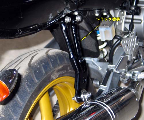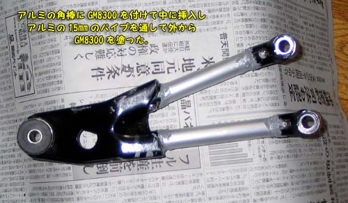 | あとは車体に取り付けて、完全に乾燥するのを1週間くらい待つことにした。 (黒の純正ノーマルの鉄製ステーのパイプの中は、少しサビ気味で汚れているにもかかわらず、面倒くさいのでそのままGM8300を塗ったが接着力はゼロに等しいようだった。あとから、やり直した方がよさそうだ。) |