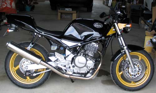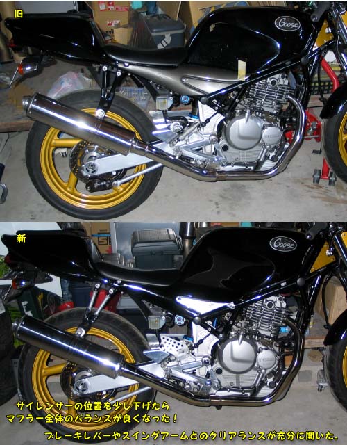 | 下の写真の上側がステーがノーマルの状態である。 ステップの部分とマフラーの隙間が少なく干渉する危険がある。 下側の写真はステーを改造してマフラーのサイレンサーが少し下がった状態である。 また、マフラーのバンドをサイレンサー中央に持ってくるようにしてみた(ノーマルの位置の方が好みかも、少し移動させすぎたようだ)。 また、サイレンサーの位置は車体から右側に離れる方向に移動したのでスイングアームとの干渉も回避できる。 ほんの少しの移動だが、マフラーから受けるバランスの悪さが少しだけ改善されたと思うのは自分だけだろうか? |