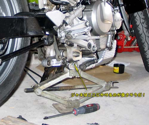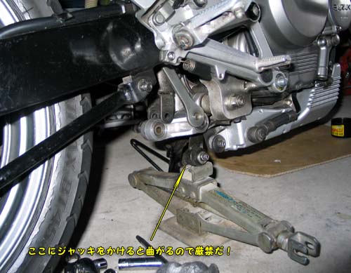 上の写真の部分にジャッキをかませると、直上の金具の部分が曲がって変形するので注意が必要である。