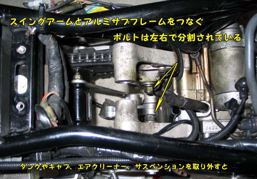 この部分のボルトとナットを外すために燃料タンク、キャブレター、エアクリーナー、サスペンションを取り外した。
