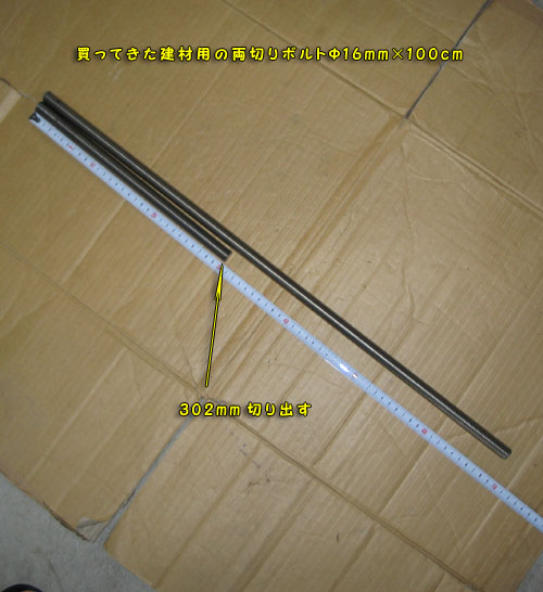 ホームセンターに直径16mmの両切りの長いステンレスネジ(建材用)を1m買ってくる(丁度良い長さのものが無かったので。ステンレス製1mで1,800円(高いよ)だったことは秘密です)。