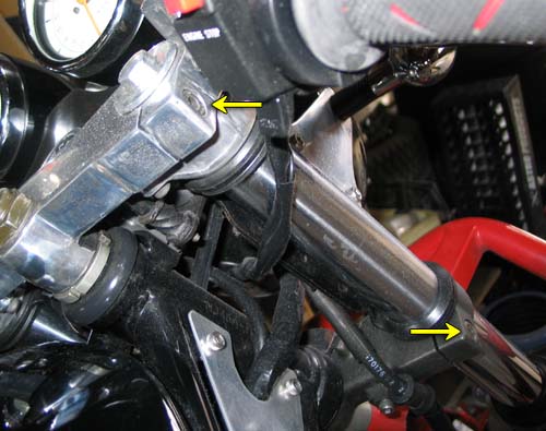 | ホイールのアクスルシャフト、フェンダー、ブレーキキャリパー、スピードメーターケーブル等を外してしまえば、下の写真の2本のネジを緩めれば、フロントフォークは簡単に外れる。 その前に、エンドキャップ-ボルト・フォーク(フォーク上方にある)を緩めておこう。 |