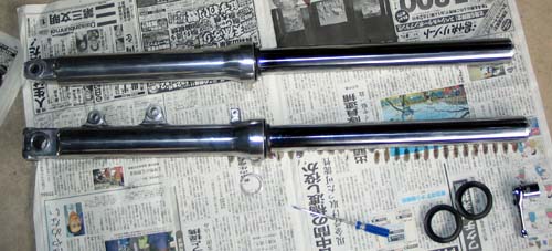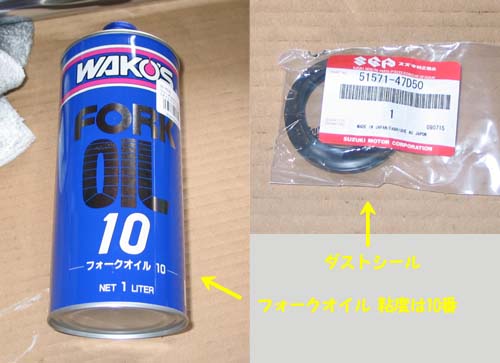 | 中古で買った時から最も気になっていたフロントフォークのオーバーホールを行う事にした。 フロントの足回りのインプレッションは、ブレーキをかけると急激にノーズダイブしてボトムしそうになることが最大の不満である。 普段は、フロントのブレーキをジワーとかけるように乗っているのだ。 フロントフォークのオーバーホールは意外と面倒で、フロント周りの物をすべて取り払う必要がある。 フォークオイルの交換を第一に考え、次に消耗部品を交換する予定だ。 シールからオイル漏れはなさそうだが、ダストシールのひび割れは確認できる。 交換部品はwebサイトから注文した。ダストシール、オイルシール1L、(いずれも純正品)そしてフォークオイルはWAKO’Sの10番(ノーマルは8番)を用意した。 |