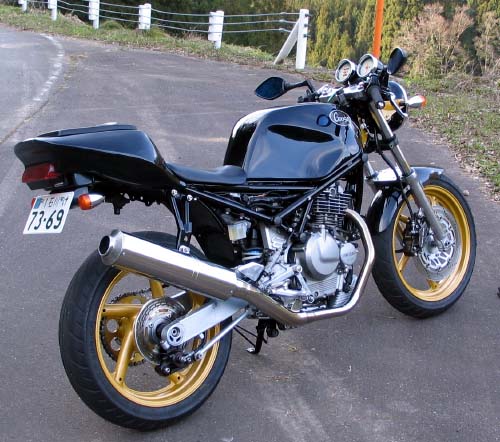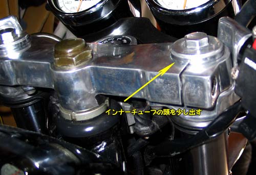 | 手でフォークを縮めてみると、あまり変化が見られないように感じる。 やはり、全部ばらして、完全なオーバーホールをした方がよかったかも? 中古で買った時は、フロンとフォークのオーバーチューブとアッパーブラケットの上面はツライチであったけれど、今回は5mm(サービスマニュアルが行方不明で数値はうろ覚えだけど)だけオーバーチューブが飛び出る形で固定した。(あとから見つかったサービスマニュアルには7mmと記されていた。) |