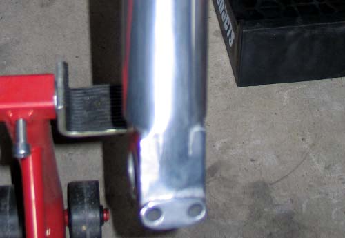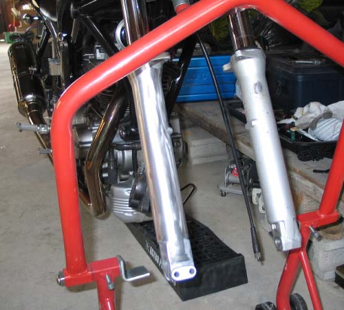 | 研磨したあと、鏡面仕上げをする予定だが、アルミは表面から少しずつ酸化して輝きが曇ってしまうので、ウレタンクリアを塗装するか、それとも鏡面を維持するために、マメに研磨するか選択しなければならない。 今回は、初めてなので塗装なしで「曇ってきたら、また磨こう作戦」で行く事にした。まずは、フロントのブレーキキャリパの ネジ、フロントアクスルのネジを緩め、バイク専用のスタンドでフロント側を持ち上げた。 フロントフォークにつながっているネジ類を外して、フロントフェンダ、キャリパー、ホイールを取り外す。 下の写真は、右側のボトムケースを350番くらいで軽くこすったところだ。 |