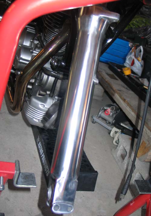 | この状態で、研磨を開始する。 まずは、サンダーにスポンジ状の350番くらいのを取り付け塗装と錆を落としていく。 表面に付いたアルミのカスを簡単にタオル等で取り除く。 下の写真は右のフォークのみ研磨。 |