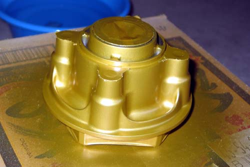 | ウレタンクリアの塗装を行おうとして準備していた時、リアホイールを空き箱にセットしようとしたとき、手がすべってコンクリートの床に落下させてしまった。 リムの部分の塗料が少し欠けたので、耐水ペーパーで滑らかに研磨してから、残りがほとんどない缶スプレーでゴールドの塗装をしたのでクリアー塗装は次週以降に。 仕事や野暮用で2週間が経過した。 やっと、ウレタンクリア塗装をする時がやってきた。 厚めに塗装する予定であったが、缶が軽くなってきたので全体に万遍なく塗ったところで終了とした。 今のところヌメッとした艶はあるが乾燥してくると塗料が痩せて凸凹で艶が減る可能性はある。 スプロケットをつなぐドラムのパーツも同様にクリア塗装した。 |