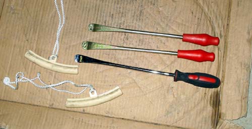 | ホイールを塗装する予定なので、ちょっと黒い斑点の除去の実験する。 フロントホイールをサイザルに白棒を少し付け軽く研磨してみた。 ホイールのスポーク部分の黒いプチプチがきれいに取れてピカピカになった。(写真を撮り損ねた) ホイールの汚れを取り除くのに使える方法ではないかと思った。 サイザルは塗装を削るので、何回も使える方法ではないと思うけれど。 では、本題のホイール塗装の準備に入る。 まず、前後のホイールを車体から外し、ホイールについているブレーキディスク、メーターのギアの部分、スプロケットを外す。 ローターのネジはネジロックを塗布して締められているので、ロングスピナーハンドルを使ったほうが良いだろう(結構硬く締まっていた)。 次に、タイヤをホイールから外す。 最初は、タイヤの空気を抜いて上手にマスキングテープでタイヤを隠せば良いかなと思ったが、どうせ塗装するのならば完璧を目指すことにした。 下の写真は、ホイールからタイヤを外すための、タイヤレバー3本とホイールを傷から守るためのガードである。 前回は、タイヤレバーをケチったせいで、ホイールにいっぱいの傷を付けてしまったので、今回はちょっと奮発して2本新しいタイヤレバーを購入したのだが、またもや少しケチったのでレバーの表面が少し凸凹している。 ホイールに傷を付ける可能性があるが、すでにたくさんの傷が付いているので、実際にはよくわからない。 タイヤ交換で最大の難関はビートを落とす(タイヤのミミをホイールの中央の凹んだ部分に落とし込む作業)ことで、ビートブレーカーがあれば簡単なのにと思ってしまう。 少しコツをつかんだように思うけど、なかなかビートが落ちないのであった。(タイヤレバーだけでタイヤ交換を行うのは、シロートには難しいのでお勧めできない。ボロいホイールとタイヤで練習するのが良いかも・・・・・・) |