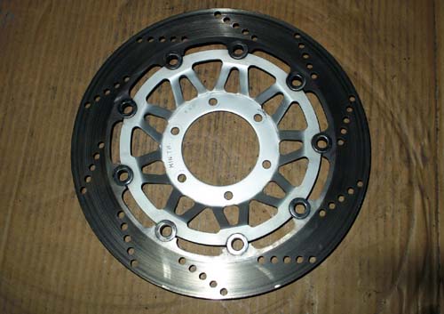 | ホイールの塗装のために、フロント-ディスクプレートを取り外した。 中央のアルマイト加工をしたアルミの部分が汚れていたので、細かいコンパウンドで磨いたが、上手く取り除けなかったので、サイザルに白棒をつけて軽く磨いてみた。 強く押し付けるとアルマイトの部分が削れてしまうので注意が必要だけど。 また、今までディスクがフローティングされていると思っていたけれど、しっかりと固定されているようだ。ディスクブレーキのキャリバーは前後ともにバッドを外し、ピストンの状態を確認し汚れを落してから組み立てた。パッドはまだ充分に使用可能であったので、一回以上交換してあるようだ。取り付け等に問題はなかった。 |