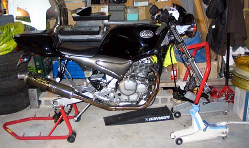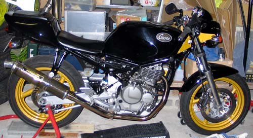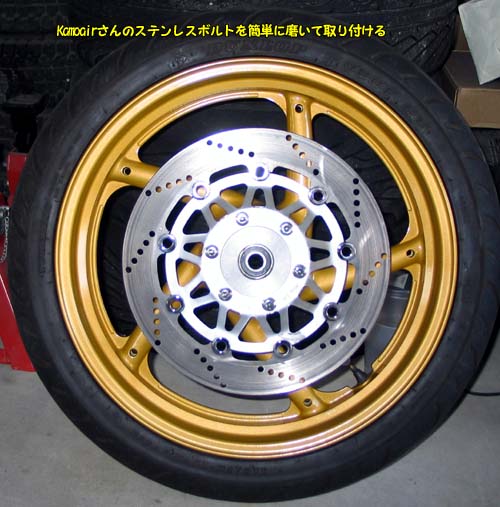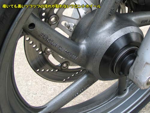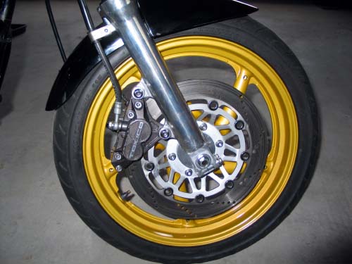 | フロント周りのリニューアルは、ホイールだけではなく、ボルト類のステンレス化と古ぼけた部分の研磨やフォークの鏡面化で一気にきれいに変化した。 ブレーキキャリパーやブレーキホースやその接続部分の劣化がより目立ってしまった。 |