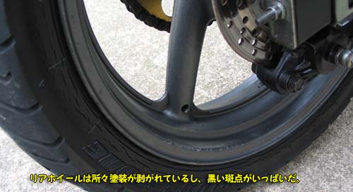 | 純正のホイールの塗装は無残にも塗料がはがれた部分があり、表面の黒い斑点はワックスやコンパウンド等のハンドパワーでは上手く除去できない。車体の色を考えるとダークグレーメタリックはちょっとおとなしい色に感じる。 |