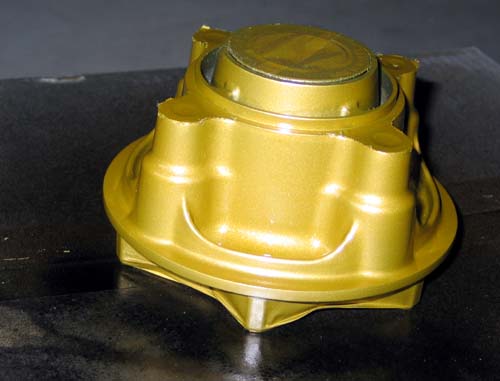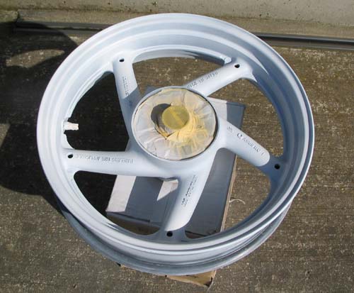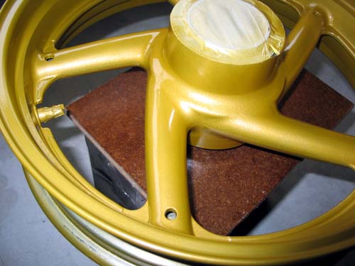 | ホイールが単独になったところで、耐水ペーパーの600番で簡単に全体をなでて細かな傷をつける。 スポークの部分の梨肌の凸凹をサンダーにFCディスクを付けて少し平らにならした(たくさん削ると耐久性に問題があるかも)。 マスキングは塗料が付いてはいけない部分に、紙テープを貼って、はみ出た部分をカッターで切り取るだけだ。 塗料がはじくのを防ぐためにシリコンオフを使ってきれいに脱脂する。 |