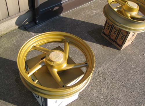 | ホイール用の缶スプレー1本で前後のホイールを塗装しようと思ったが、複雑な形状で、左右両面塗る必要があるので2本の缶スプレーを使用した。 もう少し厚塗りをしたかったけれど、1本1200円の缶スプレーをもう一本買う財源がなかったのであった。 塗り方は、最初は薄っすらと軽く色が付く程度で全体に塗ってからはじくところがないか確かめながら塗る。 少し乾燥させて、次から本塗りだけど、塗料が足りるかどうかわからなかったので、うす塗りを3回ぐらい重ねるように塗ることにした。 塗料はソフト99のホイール用でゴールドを選択。 思っていた以上の塗りやすさだった。 ただ、自分が想像していたゴールドよりも明るく黄色ぽい色になった。 |