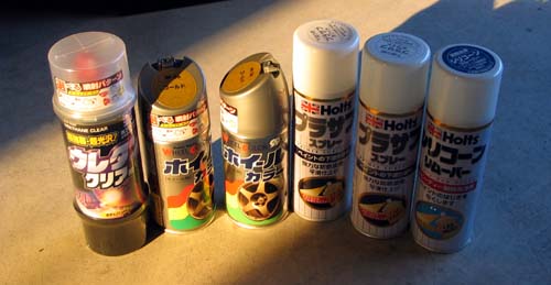 | 今回使用したスプレー缶は下の写真で、シリコンオフとプラサフ半分以外は新規で購入した。 約6,000円の出費は金欠の私には痛いけれど。 |