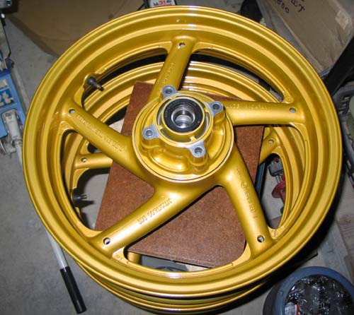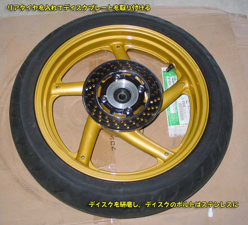 | ウレタン塗装を済ませてから、2週間くらい充分に乾燥するまでタイヤを組むのを待つことにした。 タイヤはホイールに取り付けるのは外すのと比べると簡単だけど、新らしく塗装したので少し緊張しながら慎重に組み入れた。 タイヤレバーを使わずにビートクリームだけで入れるつもりだったけれど、どうしても入らなかったので、タイヤレバーを塗装を傷つけないように注意しながら行った。 でも、一箇所だけ、1mmくらいの塗装の欠けが出来てしまったが、目立たなかったので無視することにした。 アルミと下塗りの相性が悪かったのかもしれない。 ディスクはステンレスボルトにネジロック(パーマネックス:ネジロック)を少量付けて取り付けた。 その前に、ディスクを簡単に研磨して見た目を向上させてある。 実は、リアブレーキのディスクがすごい段付きとなっているので、オークションで350のディスクを購入してあったのだけれど、ディスクの厚みが違うことが判明した。 350のディスクは重いので250純正のディスクを簡単にきれいに汚れを落として使用する事にしたのであった。 タイヤの空気圧は標準が前後とも2.0kg.cm2であるが、少し高めの2.1kg.cm2とした。 理由が自分の体重が現在68kgと少し重めであるからであった。 |