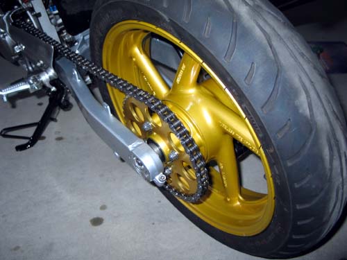 | リア周りは、スプロケット側の写真だが、金色ばかりで面白味はないがきれいになった。 ブレーキ側は、フロントと同じくキャリパー辺りの劣化が目立ってしまったといえる。 |