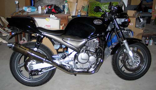 | 組み立ててから、エンジンを始動させてみた。全体的に音量は少し大きめに感じる。 また、歯切れの良い音になっている。 音質は、ノーマルよりもさらに低音よりになっているが、軽くレーシングさせただけなのでハッキリとはわからない。 マフラーの造形はどちらかというとノーマルのエキゾーストパイプの方が好みである。 全体的なバランスもノーマルの方が良いと感じるけれど、目が慣れれば大丈夫かもしれない。 まあ、ノーマルの大きな黒いチャンバーがなくなっただけでも大きな進歩であることには間違いない。 |