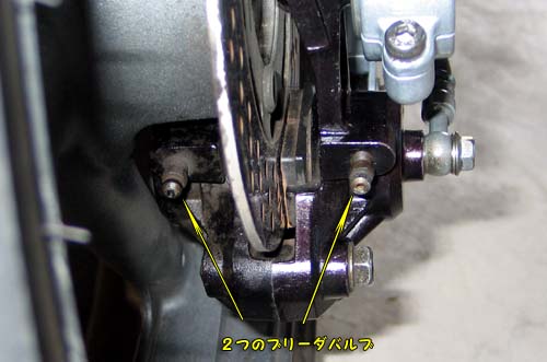 | グースのリアのブレーキキャリパーは良く見ると対向ピストンのようで、エア抜き用のブリーダーボルトが内と外と2箇所にある。 2つある理由は対向ピストンでキャリパーがディスクの下側に取り付けられているために、エアが左右に分かれてしまうためのようだ。(ディスクの上側にキャリパーがある場合は左右のどちらかにブリーダバルブがあれば良い、フロントは一箇所だし) |