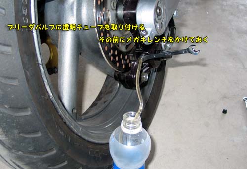 | 2つあるブリーダバルブのどちらからすればよいかわからなかったけれど、マニュアルには何も記されていないのでどちらからしても問題は無いのだろうと予想できる。 自分は外側から始める。 ブリーダバルブにメガネレンチをかけてから透明のチューブを取り付ける。 |