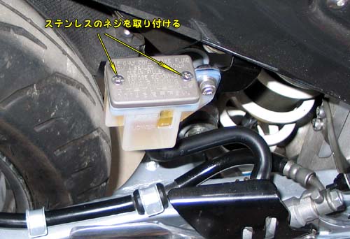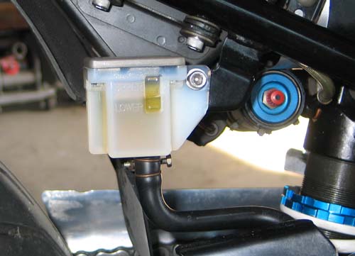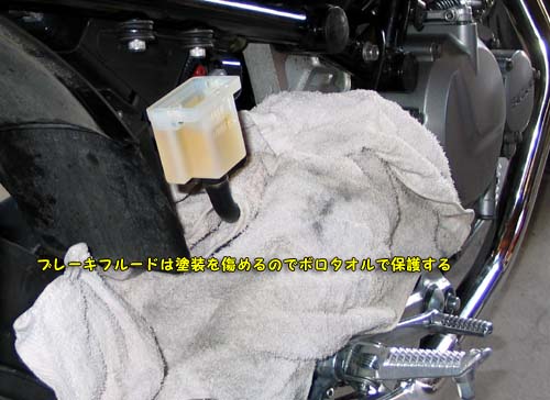 | リアのスイングアームを交換する時にリアブレーキのホースがアームの内側でワッカを通っているためにブレーキホースを一旦外す必要があった。 外したついでに新品のリザーバータンクに交換して、ブレーキフルードを入れることにした。 ゴミが入らないように注意する。 |