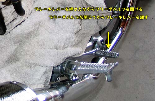 | ブレーキフルードをタンクに注いだら、ブレーキレバーを押し、押したままブリーダバルブを開く。 ブリーダバルブを閉じてからブレーキレバーを離す。 この操作を繰り返すのだが、注意することは、リザーバータンクのフルードがなくなる前に小まめに注ぎ足すようにする。 また、ブリーダバルブを開いたままブレーキレバーを離すとバルブからエアが逆流するのでレバーを離さないよう注意する。 透明のチューブにエアが混ざらないようなら、もうひとつのブリーザバルブのエア抜きを行う。 こちらは1回か2回でエアの混入は無くなるが念のため4回くらい行った。 |