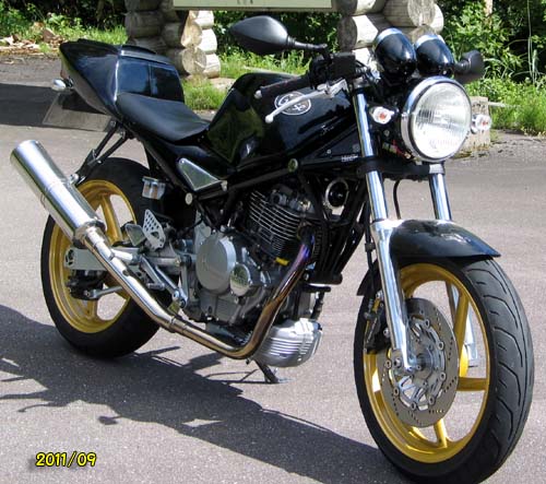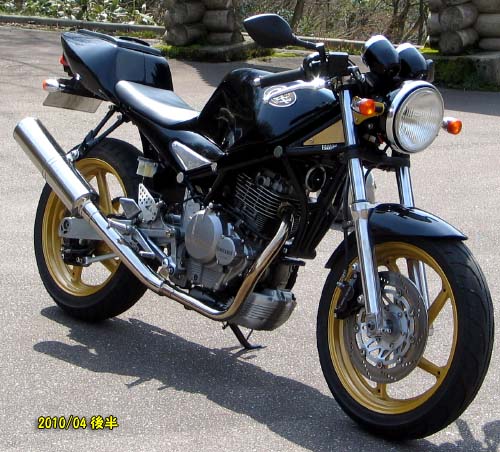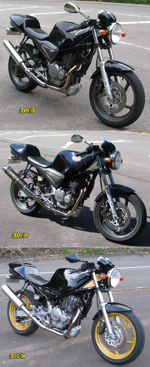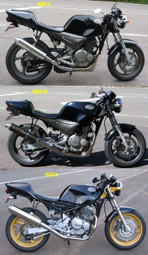 | 写真で見る自分のスズキ グース250の移変りだ。中古で買ったのだが、外見はリアのフェンダーが最初から無かった以外はほとんどノーマルのように思う。 エキゾーストパイプやサイレンサーのデザインは純正ノーマルの方がバランスよくまとまっている。 定かではないがヨシムラのマフラーは、前期の形のようで、エキゾーストパイプの種類はたぶん後期型の方がかっこいいと思う。 2010/04後半では、サイドカバーを切って小さくしてみた。 |