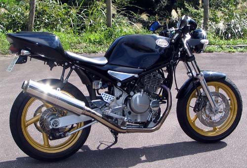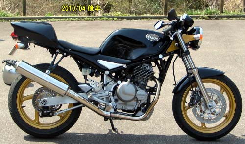 | エキゾーストパイプの取り回しがノーマルは巧みにうねらせてなだらかにカーブを描くのに対して、ヨシムラマフラーはカクカクと曲げられてセクシーさがない。 また、エンジンとパイプが離れすぎているのも大きな減点対象だ。2010/04後半ではサイレンサーステーを改造して伸ばしてマフラーのレイアウトを適正な位置に! |