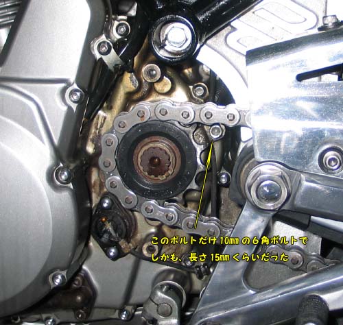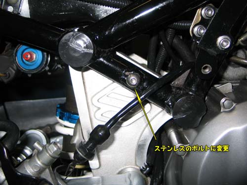 ケースをつないでいるのではなく、ケーブルがチェーンやスプロケットと干渉するのを避けるためのニュートラルセンサーの配線ケーブルの固定具(ガイド)を留めるためのボルト?だったのでホームセンターのステンレスキャップボルトを使用した。