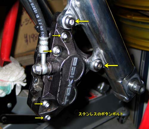 キャリパー4本とフォークの取り付け部分2本の計6本をステンレスのボタンボルトに交換した。