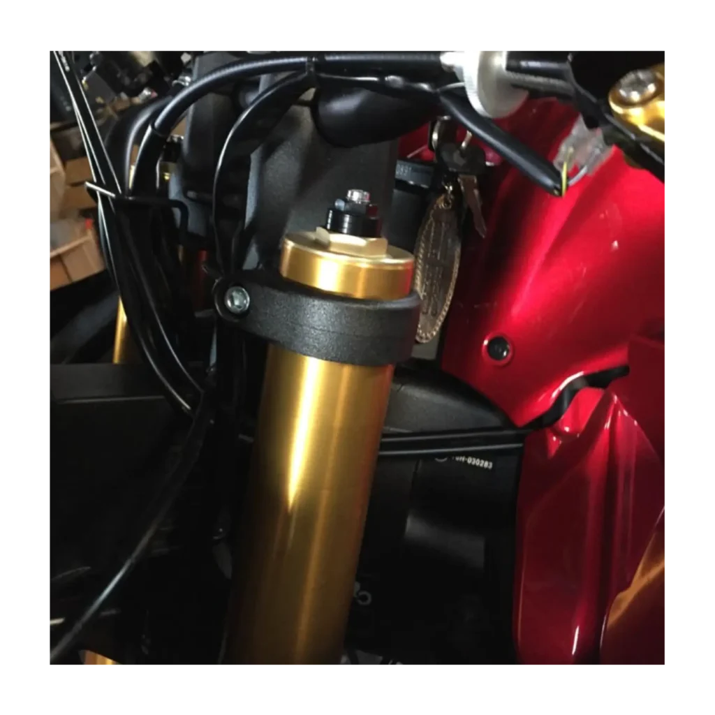 下げる量は、フロントのフェンダーとのクリアランスを考えるとこのくらいが限界かな?今の所他のパーツとの接触は見られませんでした。