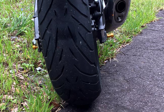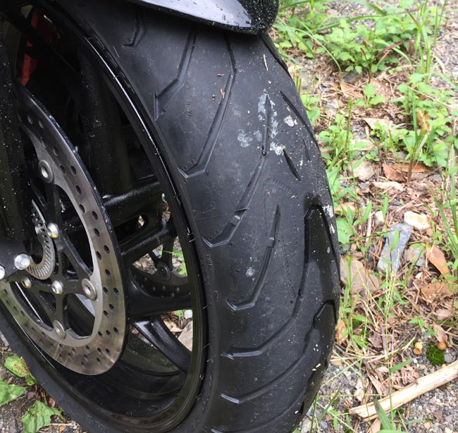 | ピレリーエンジェルSTだけど、まだ、皮むきの段階だがグリップは強い感じはしませんが、心配するほど滑るわけでもないです。 いつもよりも随分と注意深く走っているのでタイヤのサイドまで使っていないけど、自分の走り方では過不足無いかもしれません。 ライフは10,000kmくらいはもって欲しいなと思っていますが。 |