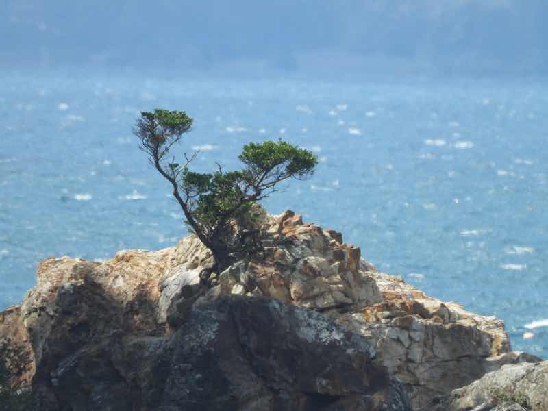 海の中の岩に小さな松の木が、自然の盆栽のような