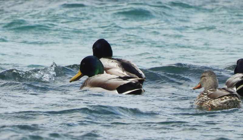 海の向こうに波で見え隠れする鴨の家族だろうか。