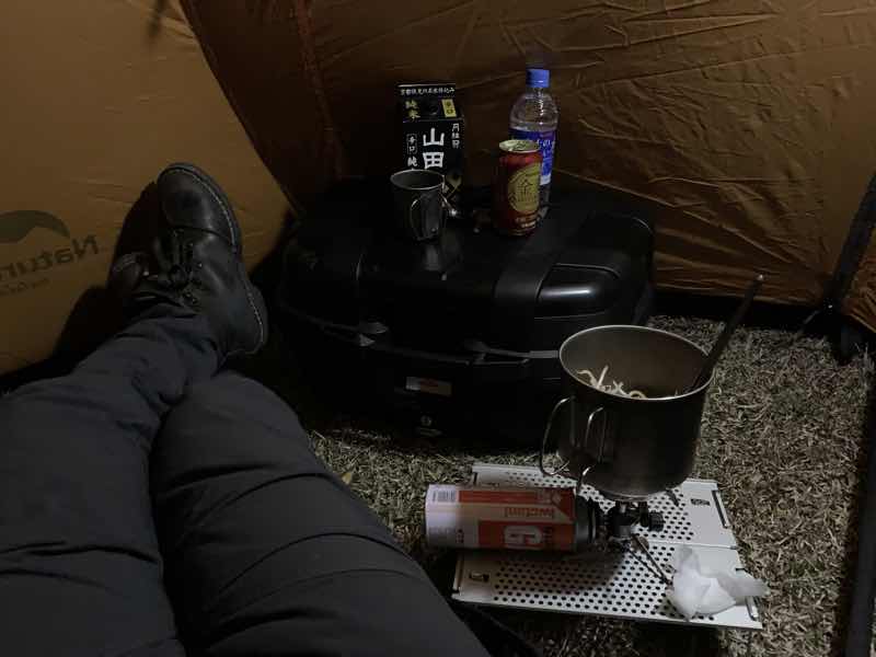 夜になっても外は強風が続いたのですが、ネーチャーハイクのHIBY3のテントは、前室がある程度の広さがあるので、そこで過ごすことにしました。