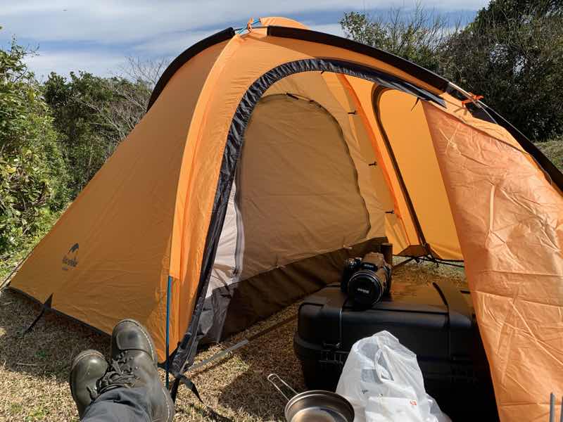 最大の特徴は、一人で使うには前室が広いことで、タープがいらないこと。