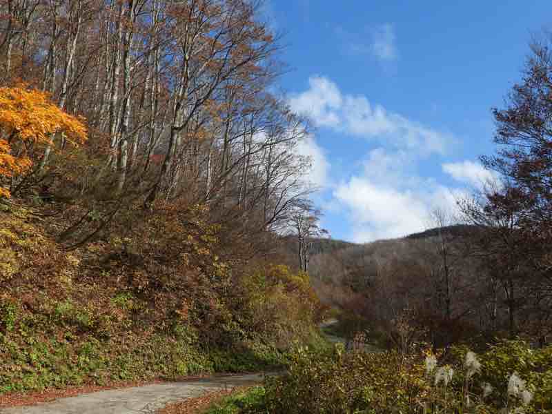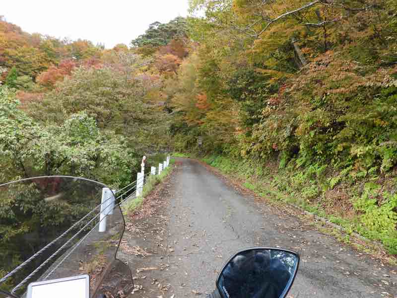 道幅は狭く、5割くらいはウエット路面で、おまけに落ち葉がたくさんあるので、それにロードタイヤで乗ると滑る滑る、さらに、緑色の苔まで生えているのでビビりながら走行しました。