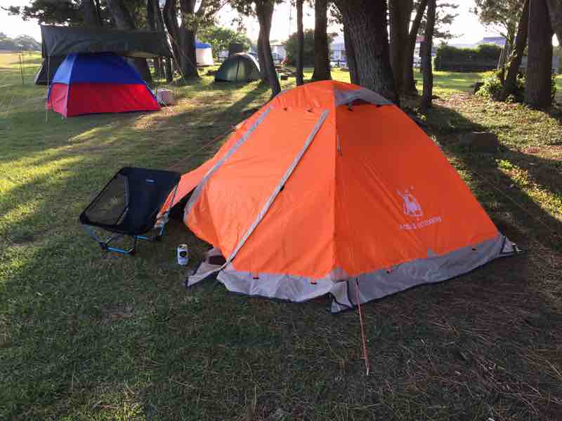 紀伊半島最南端の潮岬(しおのみさき)キャンプ場でテントを張りました。 時期よっては有料らしいが、今回は無料でした。 整備された広場があるので、開放感があって気持ち良いが風当たりが強いので、今回は外で料理や焚き火はしないことにしました。 車やバイクの乗り入れはできないが駐車場から近いところにテントを張れば問題ないと思います。 木が植えられているので木陰をうまく使えば風や日差しをある程度は遮ることも可能です。 今回は気持ちがいいのでここで連泊することにしました。