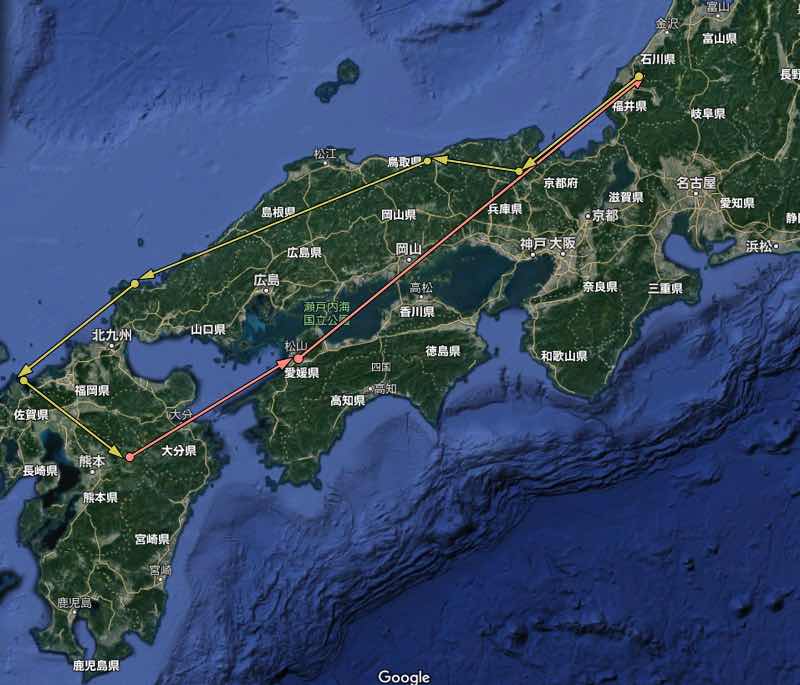 グーグルマップで調べてみると、北陸への最短距離は、四国経由となりました。